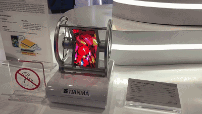 此次天馬展出多款柔性產(chǎn)品,其中這款5.99英寸18:9外彎折疊的全面屏,屏幕的上、左、右均為0.85 mm的窄邊框,搭配雙排COF設(shè)計(jì),具有超高屏占比,彎折半徑為5 mm,彎折角度可達(dá)0~180,模組厚度更是小于0.25 mm,分辨率為2160×1080,解析度達(dá)到真正的FHD 403 PPI。