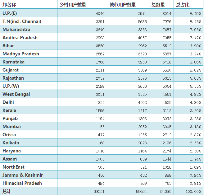 從鄉(xiāng)村用戶數(shù)量來看,U.P.(E)邦以4040萬數(shù)量排名第一,占總鄉(xiāng)村用戶數(shù)量的10.27%。