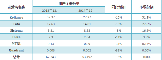 CDMA雖然在2001就進(jìn)入印度,但發(fā)展緩慢。2014年12月底,注冊用戶數(shù)量僅為0.53億。用戶數(shù)量不增反而出現(xiàn)緩慢減少的情況。
