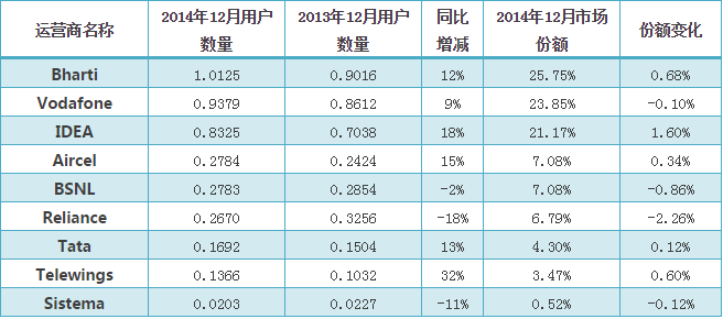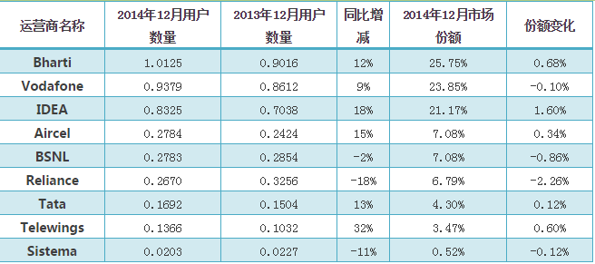截止2015年1月,印度移動(dòng)運(yùn)營商有13家。其中Bharti、Vodafone、Idea、Reliance、BSNL、Aircel是全國性運(yùn)營商,其余為區(qū)域性運(yùn)營商。