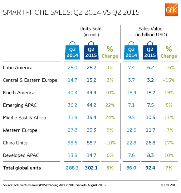 同比下滑的情況在今年第二季度仍未改變,根據德國市場研究機構GfK在今年8月公布的數據:全球其他市場的智能手機銷量在第二季度都出現了同比增長,尤其是中東和非洲,其智能手機銷量同比大增24%,但中國市場卻同比下滑10%。