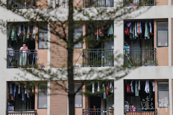 一名男工人站在宿舍陽臺上刮著胡子。
