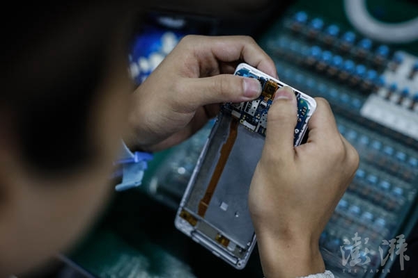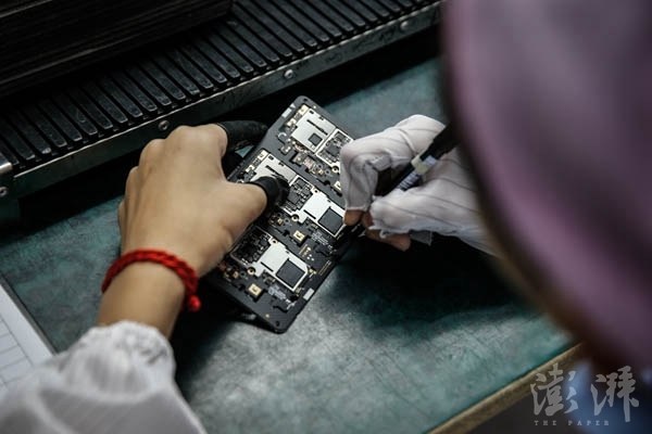 工作人員正在對主板進行標記。主板生產(chǎn)是除物料采購?fù)猓a(chǎn)手機環(huán)節(jié)的第一個步驟。