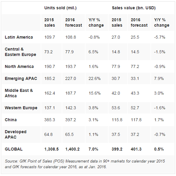 GfK預(yù)期,2016年廉價(jià)智能手機(jī)市場將繼續(xù)增長,整體智能手機(jī)銷量也將增長,但是整體營收增長幾乎出現(xiàn)停滯,僅增長0.4%,銷售額在4014億美元左右。