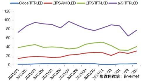 2015-2016年中國智能手機面板分技術(shù)類別出貨量(百萬片)