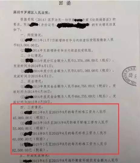 網(wǎng)上流傳的這份資料是華為給深圳市羅湖人民法院的回函,回函中詳細列舉了華為某位職級22級、職位為地區(qū)部門銷售副總裁的員工收入情況。