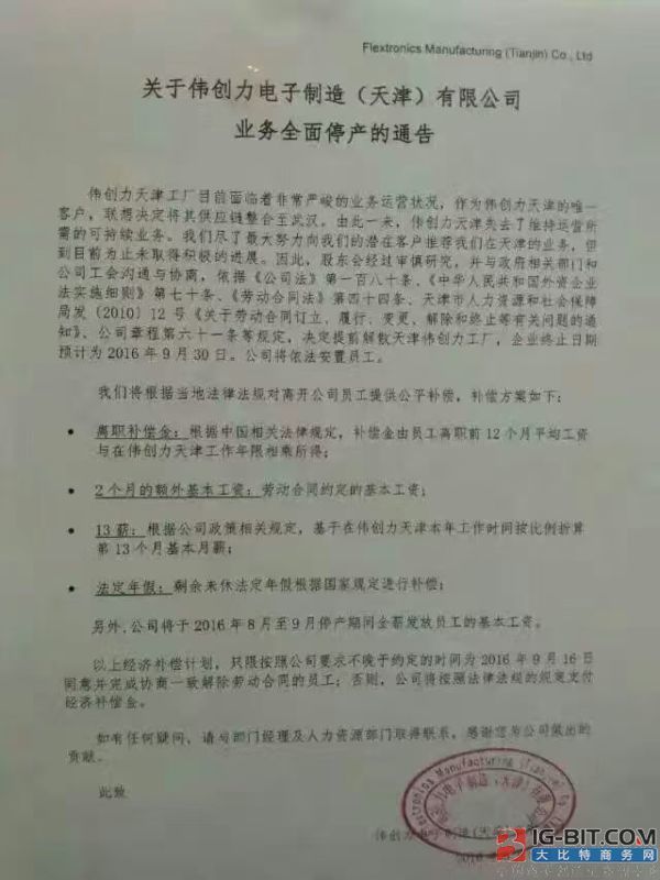 偉創(chuàng)力電子制造(天津)有限公司是世界五百強(qiáng)企業(yè)、全球第一大EMS(全球?qū)I(yè)代工產(chǎn)業(yè))廠商---美國偉創(chuàng)力(FLEXTRONICS)集團(tuán)在天津的獨(dú)資企業(yè)。根據(jù)該公司發(fā)布的停產(chǎn)公告,聯(lián)想是其唯一的客戶,由于聯(lián)想方面決定將產(chǎn)業(yè)鏈整合至武漢,而偉創(chuàng)力天津公司方面沒有其他潛在客戶,因此失去了運(yùn)營的可持續(xù)性,因此決定將在今年9月30日關(guān)閉工廠。