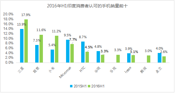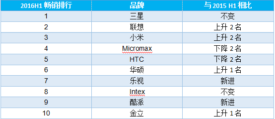 2016年上半年,中國手機品牌開(kāi)始發(fā)力,改寫(xiě)印度手機市場(chǎng)格局。印度市場(chǎng)暢銷(xiāo)品牌排行榜上,三星依然維持霸主位置,聯(lián)想和小米分別上升2位為名列第二、第三名。而樂(lè )視和酷派作為新晉品牌,一躍排到第七位和第九位,金立也有第十一位上升至第十位。而索尼、諾基亞和碩諾則退出了排行榜前十。