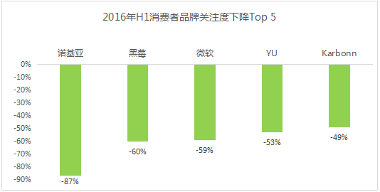 與此同時(shí),諾基亞、黑莓、微軟等品牌的消費者關(guān)注度在下降,下降幅度分別為87%、60%和59%。