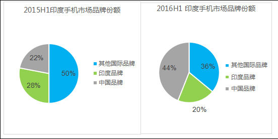 2016年上半年,印度手機市場(chǎng)形成三足鼎立之勢,其中中國品牌市場(chǎng)份額約為22%。