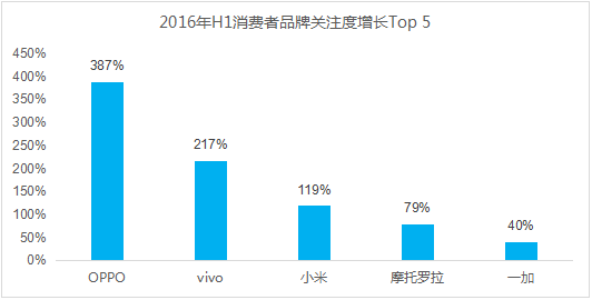 2016年上半年,國產(chǎn)手機品牌獲得印度消費者的空前關(guān)注,OPPO、vivo和小米的品牌關(guān)注度分別增長(cháng)387%、217%和119%。