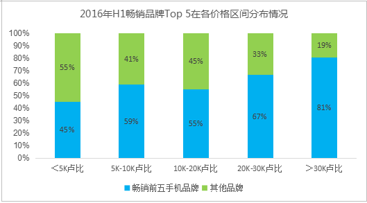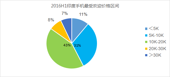 2016年上半年,印度暢銷(xiāo)品牌前五主導了30K以上價(jià)格的手機市場(chǎng),占比超過(guò)80%,其次是20-30盧比的市場(chǎng),占比為67%。
