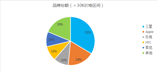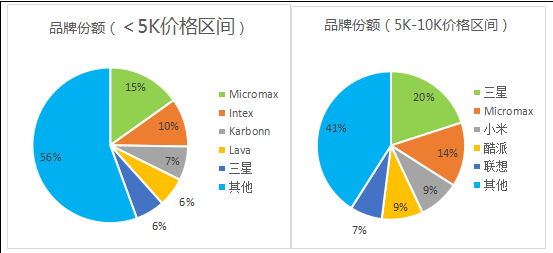 2016年上半年,印度市場(chǎng)價(jià)格5K以上的手機市場(chǎng)中,Micromax、intex和Karbonn市場(chǎng)份額分布為15%、10%和7%;在價(jià)格5K到10可的手機市場(chǎng)上,三星、Micromax、小米和酷派的市場(chǎng)份額分別為20%、14%,9%和9%;在10K到20K的價(jià)格市場(chǎng),聯(lián)想、小米和三星的市場(chǎng)份額分別為19%、17%和13%;在20K到30K的價(jià)格市場(chǎng),三星、HTC和一加的市場(chǎng)份額分別為31%、15%和10%;在30K以上的價(jià)格市場(chǎng),三星、蘋(píng)果和樂(lè )視的市場(chǎng)份額分別為33%、18%和10%。