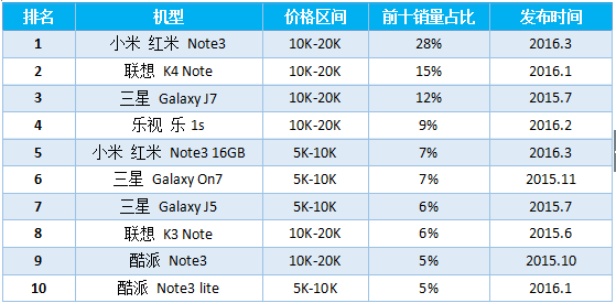 2016H1暢銷(xiāo)機型前五(10K-20K價(jià)格區間)