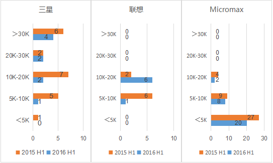 2016年上半年,三星發(fā)布的新機型主要集中在5K以上的價(jià)位,并且在5K到30K及以上的價(jià)格均有分布,而聯(lián)想則主要集中中5K到20K的價(jià)格水平,Micromax則以5K以下價(jià)格為主。
