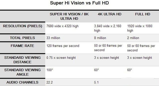 其實一直以來,4k電視都缺乏嚴謹?shù)臉?biāo)準(zhǔn)支持,除了3840×2160分辨率之外,其余指標(biāo)沿用現(xiàn)有FullHD(1080p)標(biāo)準(zhǔn),完全談不上所謂的次時代。而早已通過國際電信聯(lián)盟(ITU)和電影電視工程師協(xié)會(SMPTE)的認可的SuperHi-Vision標(biāo)準(zhǔn)則有細致的新指標(biāo),畫面幀率、標(biāo)準(zhǔn)觀看距離、視角模式以及音頻標(biāo)準(zhǔn)均有巨大的提升。