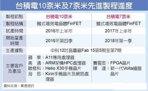 另外,臺積電7納米預(yù)估明年上半年可完成芯片設(shè)計定案,2018年第1季進入量產(chǎn),目前包括可程式邏輯閘陣列(FPGA)大廠賽靈思(Xilinx)、繪圖芯片大廠輝達(NVIDIA)兩大16納米客戶,已確定跨過10納米制程世代,直接與臺積電在7納米進行合作。