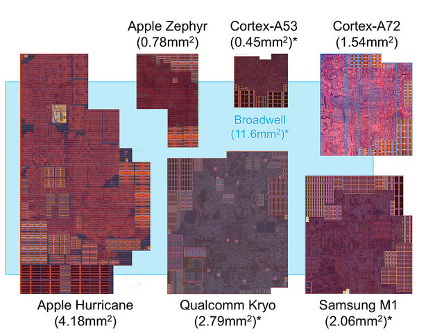 A10 表現(xiàn)驚人是因為蘋果本錢雄厚,芯片比別家更大。處理器的晶粒(die)區(qū)域要價高昂,Hurricane 卻大量使用,Hurricane 面積為 4.18 平方毫米,尺寸約為其他廠商高端處理器的兩倍。蘋果不賣芯片賣手機,在晶粒多花個幾美元不打緊,只要能提高整體表現(xiàn),讓產(chǎn)品更熱賣即可。