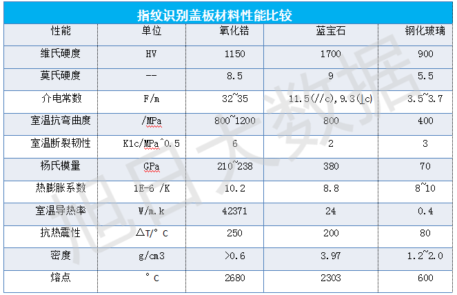 目前市場上應(yīng)用的指紋蓋板材料主要包括藍(lán)寶石、玻璃和陶瓷。藍(lán)寶石為最早使用的蓋板材料,但其高成本、韌性差等缺點(diǎn)促使玻璃和陶瓷材料的應(yīng)用。三種材料的比較如下: