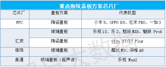 FPC、匯頂為指紋蓋板方案主要供應(yīng)商。目前,手機(jī)市場上應(yīng)用的指紋蓋板方案幾乎都出自于FPC和匯頂。其中FPC的蓋板方案主打陶瓷,應(yīng)用的手機(jī)機(jī)型包括小米5、OPPO R9、紅米PRO、一加3等。而匯頂則是名副其實(shí)主打蓋板方案的指紋芯片廠,蓋板方案包括玻璃和陶瓷,其玻璃方案更是目前使用最為廣泛的指紋芯片,應(yīng)用機(jī)型包括樂視1S、樂2、魅族MX6、魅族Pro6等,而vivo X7/X7 Plus的陶瓷蓋板方案則匯頂與FPC一起供應(yīng)。
