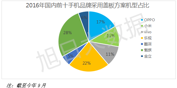 蓋板方案受魅族青睞。下圖顯示,今年1-9月,魅族發(fā)布的指紋手機(jī)幾乎都采用了蓋板方案,其中包括PRO6、MX6、魅藍(lán)3S、魅藍(lán)E以及魅藍(lán)Max五款機(jī)型,占比28%。樂視采用蓋板方案的機(jī)型達(dá)到4款,占比達(dá)到22%。而一向重視外觀設(shè)計(jì)及用戶體驗(yàn)的OPPO和vivo使用蓋板方案的機(jī)型包括R9、R9 Plus、A59三款機(jī)以及X7、X7 Plus,分別占前十品牌的17%和11%。