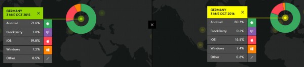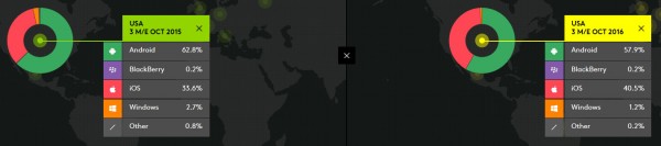 來自Kantar Worldpanel的最新季度數(shù)據(jù)顯示,在美國智能手機市場,蘋果iOS設備在第三季度市場銷售總份額當中占比達到40.5%,和去年同期相比,份額上升7%,這在很大程度上受益于三星Galaxy Note 7召回事件。但是在中國智能手機市場,iPhone面臨本地Android競爭對手更激烈的競爭,如市場份額極速上升的OPPO等等,蘋果在第三季度中國智能手機銷售額中占比17.1%,低于前一年的22.5%。而在歐洲德國市場,iPhone第三季度市場份額下降2.7個百分點至16.5%。