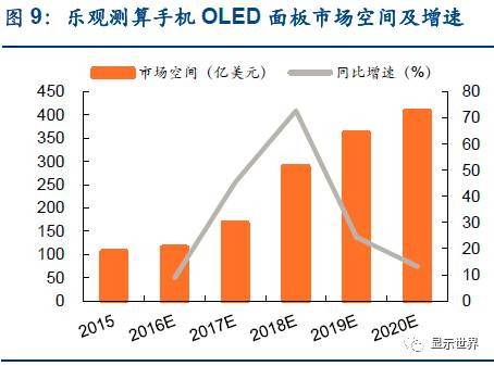 根據(jù)上表,2015年全球手機OLED面板的市場空間約為105億美元左右,如果再分別按照保守預測和樂觀預測,可以得到2020年全球手機OLED面板的市場空間分別達到207.64億美元和408.18億美元,5年間的CAGR分別為13.93%和30.42%。由于iPhone8將大概率采用OLED面板,整個智能手機的顯示面板市場也有可能因此而發(fā)生實質(zhì)性的變化,因此我們更傾向于UBIResearch的樂觀測算結(jié)果。