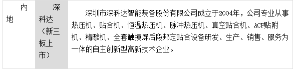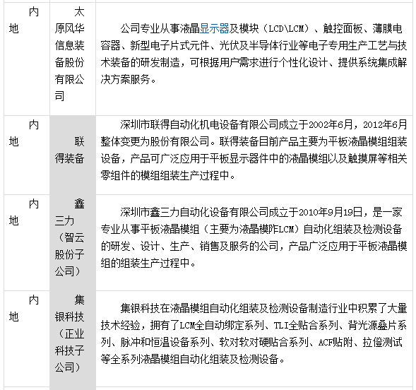 對于后段整機流程,我們建議重點關(guān)注聯(lián)得裝備和鑫三力,聯(lián)得裝備已有針對LCD顯示面板全貼合工藝的OCA全自動全貼合設(shè)備,OCR貼合機設(shè)備、玻璃對玻璃以及薄膜對玻璃等整機全貼合設(shè)備,技術(shù)儲備豐富,彈性較大,重點關(guān)注聯(lián)得裝備對OLED工藝更新的跟進情況。鑫三力目前也正在進行新一代全貼合設(shè)備的研發(fā),同時公司的邦定設(shè)備技術(shù)水平在國內(nèi)領(lǐng)先。