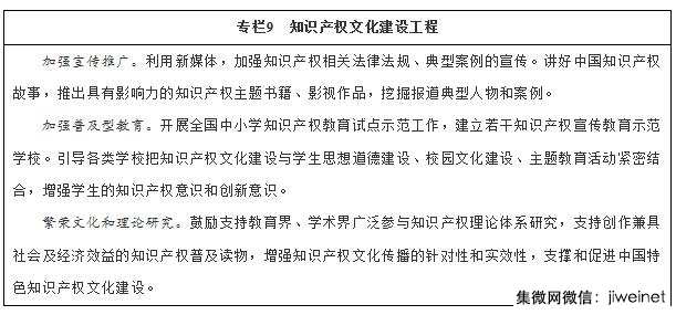 2.實(shí)施知識產(chǎn)權教育推廣計劃。鼓勵知識產(chǎn)權文化和理論研究,加強普及型教育,推出優(yōu)秀研究成果和普及讀物。將知識產(chǎn)權內容全面納入國家普法教育和全民科學(xué)素養提升工作。