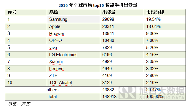 根據(jù)旭日大數(shù)據(jù)統(tǒng)計(jì)數(shù)據(jù),2016年,全球智能手機(jī)出貨量約為14.89億部,其中,三星和蘋(píng)果的出貨量均較2015年有一定幅度下降,而中國(guó)手機(jī)品牌華為、OPPO和vivo則大幅增長(zhǎng),包攬全球智能手機(jī)出貨量top5的三個(gè)席位。三星仍以2.9億部位列第一,蘋(píng)果位居第二名,出貨量約為2億部,而華為、OPPO和vivo的出貨量分別為1.39億部、1.04億部和7.83億部。