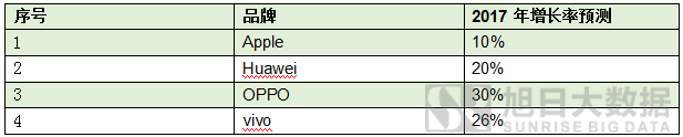 智能手機(jī)發(fā)展已趨于成熟,2017年,手機(jī)硬件創(chuàng)新方向?qū)⒓性诨∶娌A鈿?、AMOLED顯示屏、雙攝像頭和快速充電等方面。2017年,全球智能手機(jī)將形成中國(guó)品牌手機(jī)和蘋(píng)果iPhone手機(jī)將成為最大的市場(chǎng)推動(dòng)力,并由此推動(dòng)手機(jī)領(lǐng)域的持續(xù)創(chuàng)新。根據(jù)旭日大數(shù)據(jù)預(yù)測(cè),2017年,三星智能手機(jī)的增長(zhǎng)率約為3%,蘋(píng)果iPhone的增長(zhǎng)率10%,而國(guó)產(chǎn)品牌華為、OPPO和vivo增長(zhǎng)率雖較2016年會(huì)緩慢一些,仍會(huì)較高的增長(zhǎng)空間,預(yù)計(jì)OPPO將繼續(xù)保持30%左右的增長(zhǎng),而vivo和華為的增長(zhǎng)率預(yù)計(jì)分別在26%和20%左右。