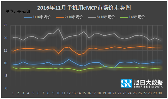 旭日大數(shù)據(jù)研究數(shù)據(jù)顯示,2016年11月,小容量1GB+8GB的eMCP市場平均價(jià)格相對比較穩(wěn)定,小容量eMCP供應(yīng)商有可選余地,價(jià)格波動(dòng)就沒有那么明顯。