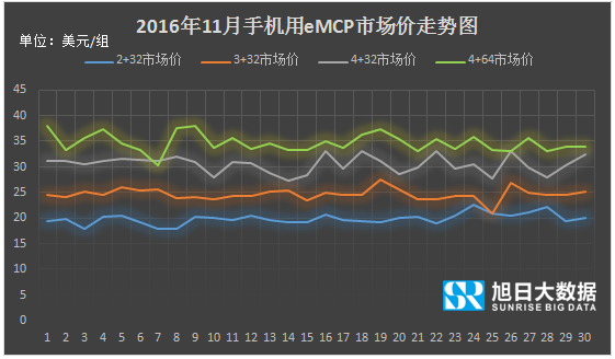 而2GB+32GB、3GB+32GB及以上容量的eMCP由三星、海力士、鎂光、東芝壟斷,價(jià)格方面全憑廠商議價(jià)能力,價(jià)格波動(dòng)幅度也較大。旭日大數(shù)據(jù)價(jià)格跟蹤顯示,各容量eMCP價(jià)格在11月內(nèi)仍處于上漲趨勢,漲勢不明顯。