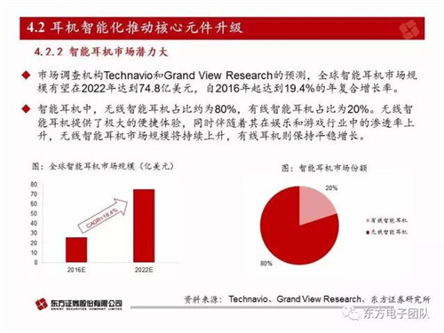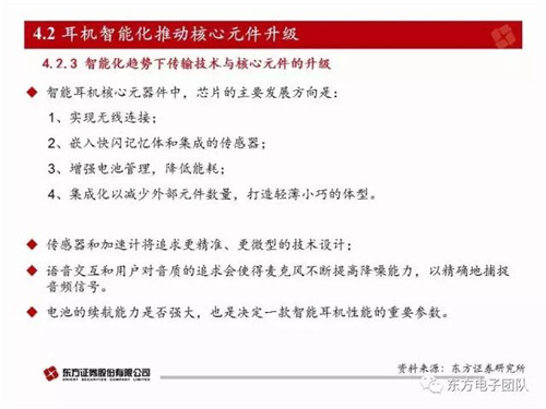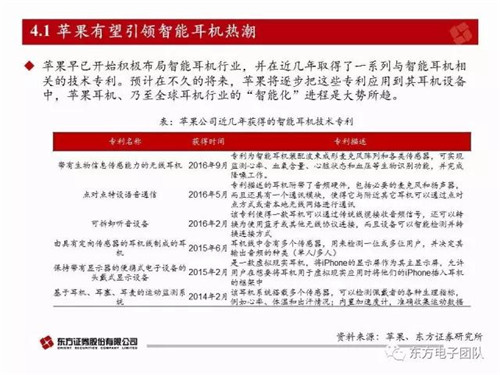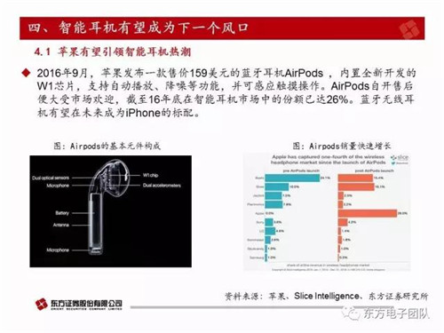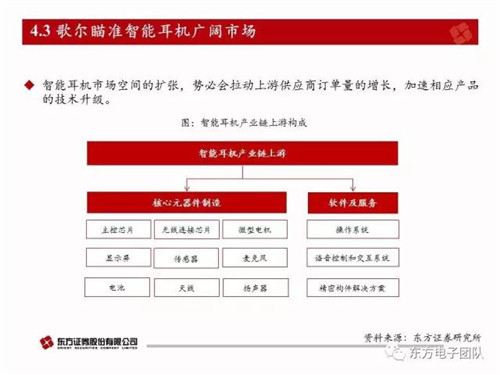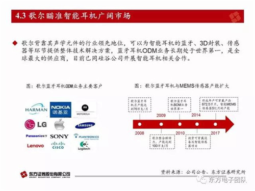 智能耳機(jī)有望成為下一個(gè)風(fēng)口:蘋果去年發(fā)布AirPods,有望引領(lǐng)智能耳機(jī)熱潮,推動(dòng)全球耳機(jī)智能化進(jìn)程,在此趨勢下耳機(jī)傳輸技術(shù)與核心元件將迎來升級需求,歌爾可以為智能耳機(jī)的藍(lán)牙、3D封裝、傳感器等環(huán)節(jié)提供整體技術(shù)解決方案,在市場占有絕對領(lǐng)先地位,目前公司已瞄準(zhǔn)智能耳機(jī)的廣闊市場,并同硅谷公司展開關(guān)于智能耳機(jī)相關(guān)合作,未來有望實(shí)現(xiàn)新的業(yè)績增長。