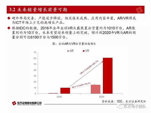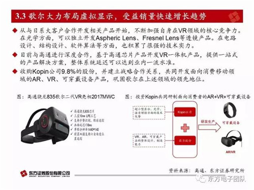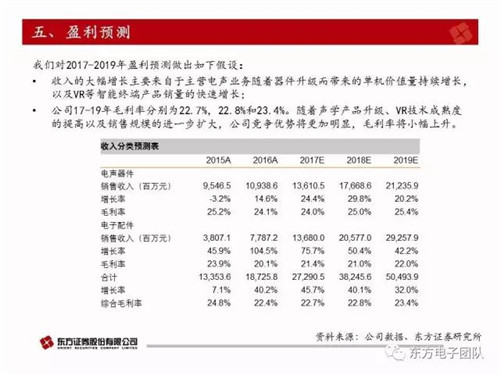 科技大廠持續(xù)發(fā)力,虛擬顯示產(chǎn)品前景可期:目前,AR/VR硬件還處于發(fā)展階段,而大陸電子廠商已越來越多地參與到AR/VR產(chǎn)業(yè)的研發(fā)制造中,未來隨著硬件布局完善、產(chǎn)能逐步釋放、相關(guān)技術(shù)成熟、應(yīng)用內(nèi)容豐富,AR/VR將成為ICT市場上少見的高增長產(chǎn)品。歌爾不斷加強(qiáng)自身在虛擬顯示領(lǐng)域的核心競爭力,17年有望借助日系大客戶銷量成倍級的增長,從而帶動(dòng)公司虛擬顯示產(chǎn)品的收入快速增長。