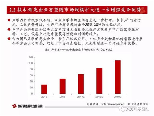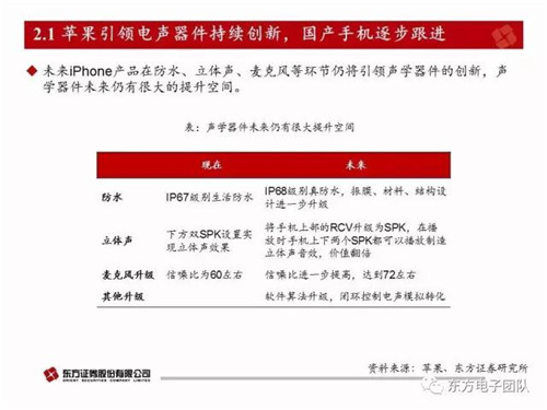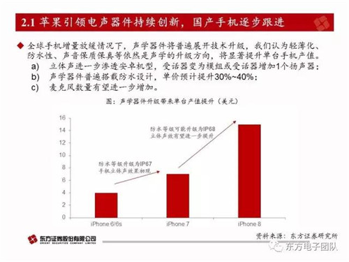 聲學(xué)器件迎來新一輪升級:預(yù)計(jì)未來的iPhone產(chǎn)品在防水、立體聲、麥克風(fēng)等環(huán)節(jié)將繼續(xù)引領(lǐng)聲學(xué)器件的創(chuàng)新,聲學(xué)器件未來仍有很大的提升空間,而國產(chǎn)手機(jī)的逐步跟進(jìn)也將推動(dòng)聲學(xué)器件升級的普及,電聲市場有望保持每年25-30%的成長速度,將超過100億美元。公司具備先進(jìn)聲學(xué)器件設(shè)計(jì)與生產(chǎn)能力,將進(jìn)一步鞏固全球電聲行業(yè)領(lǐng)先地位。