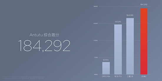 小米6搭載中國首發(fā)全球第一顆10nm制程商用芯片高通驍龍835處理器,全新Kryo 280架構、主頻高達2.45Ghz。不服跑個分?經安兔兔跑分軟件測試,小米6的綜合跑分184292分,GFXBench曼哈頓離屏測試GPU跑分63fps,遠超友商旗艦(以華為P10、OPPO R9s和三星S8為例)。