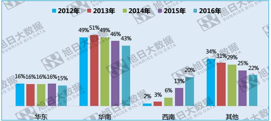 圖表 4  2012-2016年全國重點區(qū)域手機產(chǎn)量占比