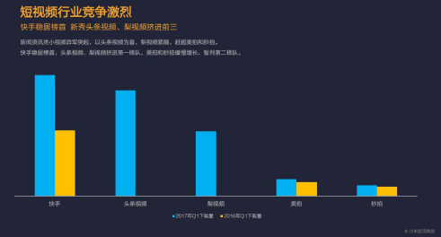進入2017年,短視頻行業(yè)市場格局發(fā)生突變。從小米應(yīng)用商店公布的下載量看,快手依舊把持榜首寶座,同比去年一季度下載量也是穩(wěn)步增長。除了快手,頭條視頻和梨視頻兩家新秀崛起并快速成長,下載量在今年一季度殺入前三,美拍和秒拍兩家傳統(tǒng)豪門落至第四、第五。