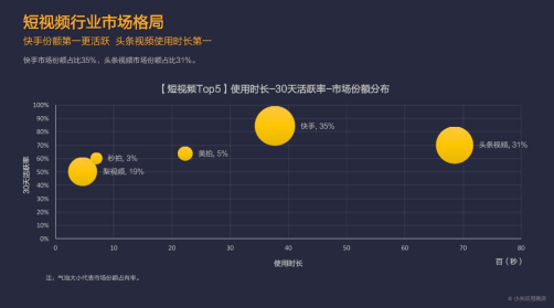 市場活躍方面,快手同樣保持領(lǐng)先。通過小米應(yīng)用商店30天活躍率數(shù)據(jù)分析,快手活躍用戶超過80%,并以35%的市場份額穩(wěn)居榜首。新生勢力頭條視頻表現(xiàn)同樣不俗,成功摘得使用時長桂冠,可見其產(chǎn)品的內(nèi)容粘性更高,且市場份額占比31%,排名僅次于快手。