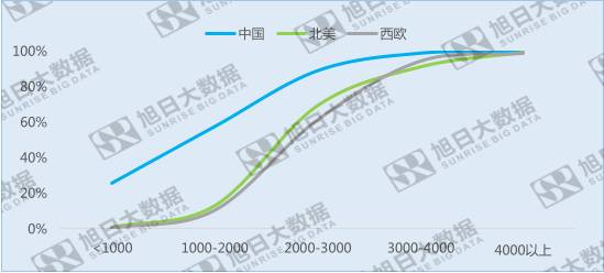由下圖可知,北美和西歐地區(qū)銷售的智能手機(jī)中3000元以上的機(jī)型占據(jù)一半以上,而中國(guó)在此價(jià)格段的智能機(jī)的銷量占比不到15%;而從2000-3000元的智能機(jī)銷量上看,中北美和西歐在該價(jià)格段智能機(jī)的占比相對(duì)較少,分別占7%和15%,而中國(guó)地區(qū)則占據(jù)接近25%。由此得出,中國(guó)、北美和西歐地區(qū)皆為中高端智能機(jī)市場(chǎng)的重點(diǎn)區(qū)域,然而,中國(guó)主要集中在中端智能機(jī)市場(chǎng),而北美和西歐集中在高端智能機(jī)市場(chǎng)。