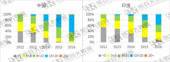 全球人口基數(shù)最大的兩個(gè)國(guó)家就在亞洲,中國(guó)、印度,龐大的人口基數(shù)帶來(lái)人口困擾的同時(shí),從商人的角度看同樣也是機(jī)遇,人口紅利下潛藏著巨大的市場(chǎng)需求和無(wú)限商機(jī)。雖然中國(guó)和印度經(jīng)濟(jì)均落后于發(fā)達(dá)國(guó)家,但是在智能手機(jī)領(lǐng)域的發(fā)展,攝像頭像素可以說(shuō)是與時(shí)俱進(jìn),跟全球手機(jī)攝像頭像素發(fā)展保持同樣趨勢(shì),攝像頭像素高端化,低像素?cái)z像頭市場(chǎng)份額逐漸萎縮。相較于這兩個(gè)國(guó)家,中國(guó)智能手機(jī)發(fā)展已走向成熟,而目前印度市場(chǎng)還有大部分的功能機(jī),智能機(jī)還處于發(fā)展階段,中國(guó)的智能手機(jī)攝像頭像素發(fā)展相較快一步,同期內(nèi)的高像素占比中國(guó)高于印度。
