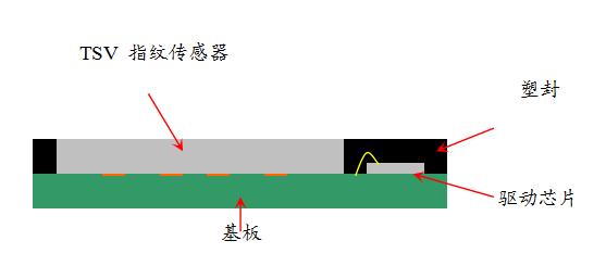 但因傳統(tǒng)的多芯片指紋識別方案有驅(qū)動芯片的存在,導(dǎo)致模組工藝有很多問題出現(xiàn)。如下圖所示,驅(qū)動芯片通過傳統(tǒng)的打線塑封方式置于TSV封裝的sensor旁邊,造成了翹曲、氣泡、縫隙、蓋板不平等很多工藝問題。因此,各廠家都在努力發(fā)展被動式單芯片指紋識別方案用于正面超薄蓋板。