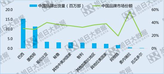 圖表2 2016年中國品牌在拉美地區(qū)各國出貨量及市場份額