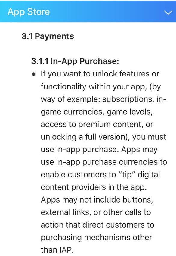 近日,蘋果公司終于將中國本土化創(chuàng)新“打賞”寫進條款,并作出規(guī)定:App內(nèi)打賞必須使用蘋果官方支付渠道——APP內(nèi)購,并向蘋果支付分成;而且相關(guān)應(yīng)用不得采用其他按鈕、外部鏈接或其他方式讓消費者使用蘋果之外的支付渠道。這也就意味著,蘋果將從贊賞功能中抽取30%的提成,也就是“蘋果稅”,如果拒絕執(zhí)行則有可能導(dǎo)致應(yīng)用下架。