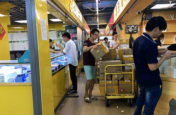 華強(qiáng)北的電子產(chǎn)品市場(chǎng)龐大、物流繁忙,半夜快遞仍舊接單。 澎湃新聞?dòng)浾?蔣晨悅 圖