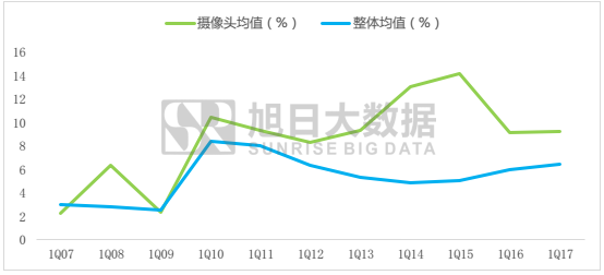 圖表2:2007Q1—2017Q1攝像頭利潤率趨勢圖