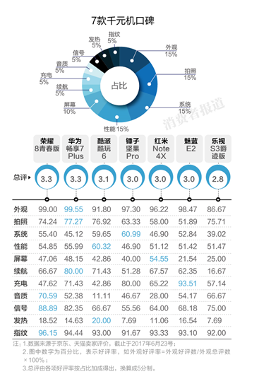 2017年6月底,《消費者報道》基于電商平臺(京東自營、蘇寧自營和品牌天貓旗艦店)上的51588條評價,對2017上半年發(fā)布的14個品牌,共20款手機進行了口碑評價。評價項目包括外觀、拍照、系統(tǒng)、性能、屏幕、續(xù)航、充電、音質(zhì)、信號、發(fā)熱及指紋。