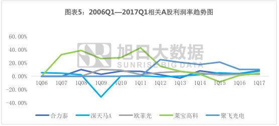 從2007年至2017年利潤率變動的方面來看,顯示屏部分的利潤率基本一直都低于手機產(chǎn)業(yè)鏈整體的利潤率水平;且自2010年之后隨著該部分競爭進一步加劇利潤率一直下行,到2015年由于與整體利潤率過度拉大才恢復性的反彈;利潤率的持續(xù)走低對利潤會形成一定的牽制,使得整個顯示屏部分的利潤一直不高,截止2017年一季度其利潤也只占整個手機產(chǎn)業(yè)鏈上市公司利潤的7.6% ;顯示行業(yè)競爭達到了混戰(zhàn)的狀態(tài),不同背景的廠商均有不同程度涉足顯示屏的行列。