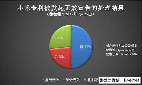 過去幾年間,小米共有30件實(shí)用新型專利被他人發(fā)起無效宣告,其中,15件專利被宣告全部無效,7件專利被部分宣告無效,僅有8件專利被維持有效。